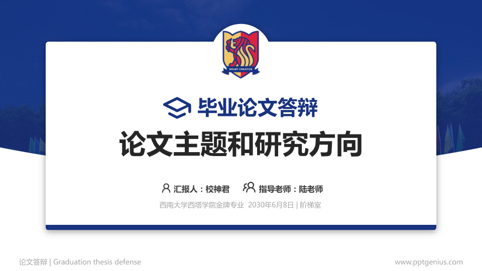 这是论文答辩,封面、校徽、主题色都与该学校相匹配,购买并下载后您可以任意修改主题配色、修改每一页PPT内容和母版内容,同时您可以通过论文答辩、西南大学西塔学院 ppt模板、ppt模板等关键词找到这套模板。