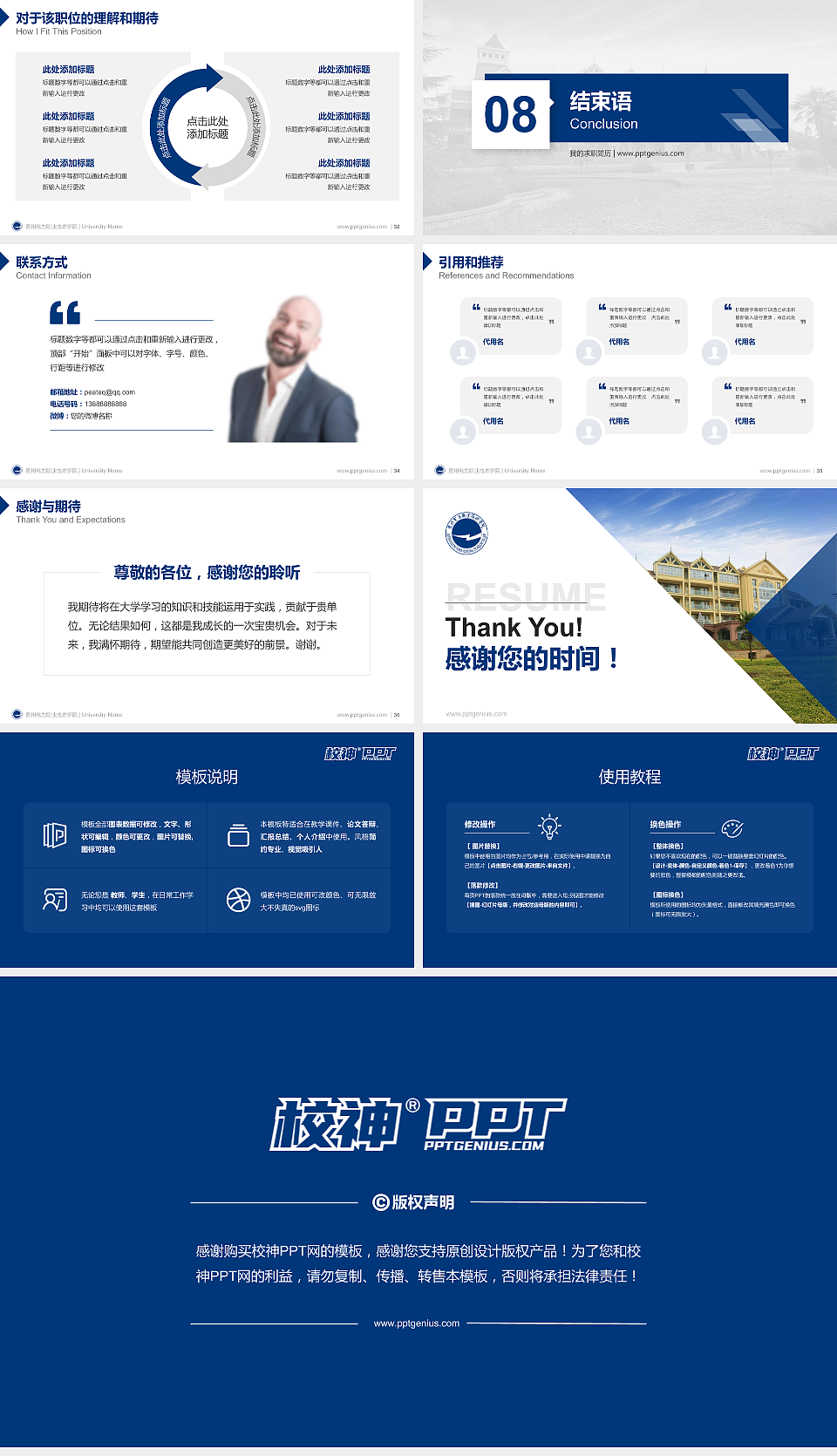 贵州电力职业技术学院教师/学生通用个人简历PPT模板下载是一套标准化的PPT模板,支持一键换色,只需按照以下步骤操作。