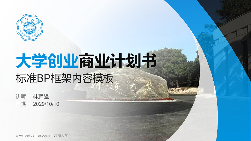 这是大赛,封面、校徽、主题色都与该学校相匹配,购买并下载后您可以任意修改主题配色、修改每一页PPT内容和母版内容,同时您可以通过大赛、河海大学 ppt模板、ppt模板等关键词找到这套模板。