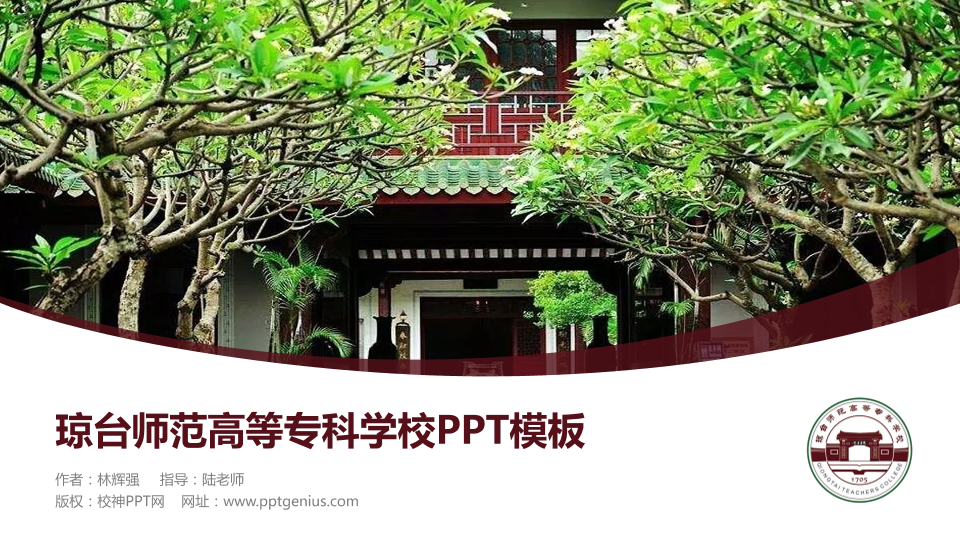 这是课程,封面、校徽、主题色都与该学校相匹配,购买并下载后您可以任意修改主题配色、修改每一页PPT内容和母版内容,同时您可以通过课程、琼台师范高等专科学校 ppt模板、ppt模板等关键词找到这套模板。
